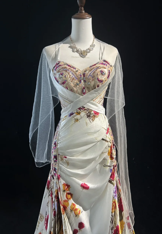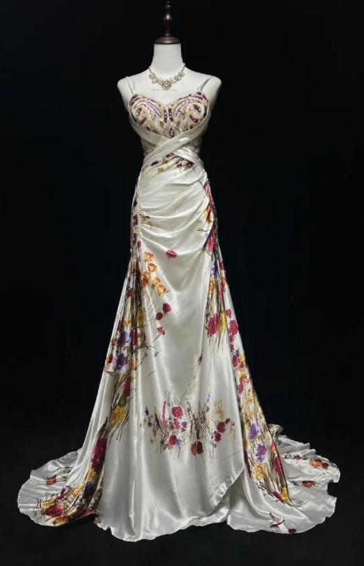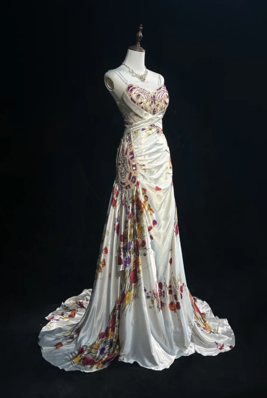 Vintage Spaghetti Strap Sheath Long Prom Dresses Floral Satin Sleeveless Evening Dress Sequin Champagne Formal Dresses HZ1121